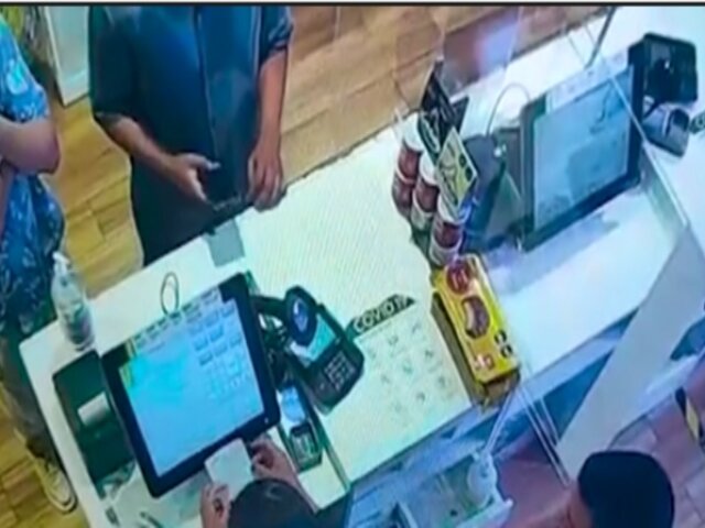 Cámaras de seguridad de una tienda de plaza San Miguel captó el momento en que los hampones que fingían ser clientes intentaban pagar costosos productos tecnológicos con una de sus tarjetas clonadas.