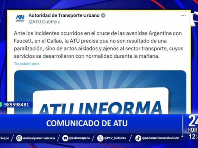 La Autoridad de Transporte Urbano de Lima y Callao (ATU) emitió un comunicado en el que aclara que los recientes incidentes ocurridos en el cruce de las avenidas Argentina y Faucett no son consecuencia de una paralización del sector transporte, sino de "actos aislados y ajenos" a este.