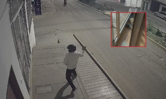 En las imágenes de las cámaras de seguridad se observa que, tras lanzar una piedra contras las ventanas del inmueble, uno de los delincuentes intenta activar una granada, pero el seguro se atoró, lo que obligó a los criminales a huir.
