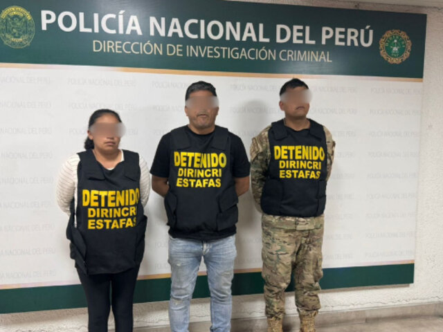 Se trata de los presuntos integrantes de la banda criminal 'Los Falsos de los Repuestos Aeronáuticos', identificados como Stephanie Francesca Ramos Boero (38), José Antonio Valladares Benavides (48) y Federico Espinoza Ordinola (36), este último vestía uniforme de la FAP.