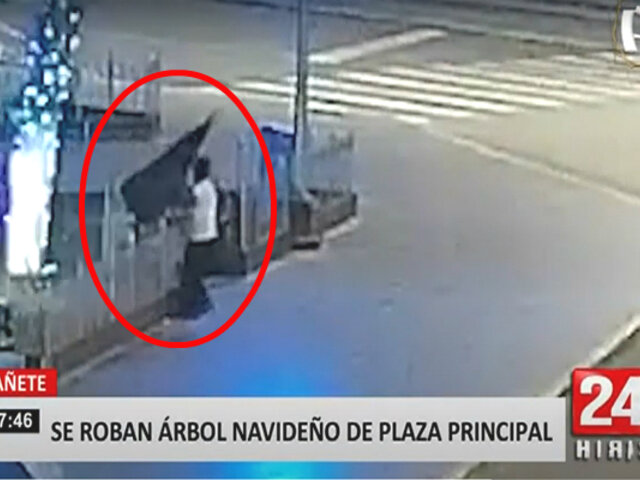 Una cámara de vigilancia registró el momento en que un sujeto se llevó uno de los árboles navideños que adornan la Plaza de Armas de Cañete, alrededor de las 3 de la madrugada.