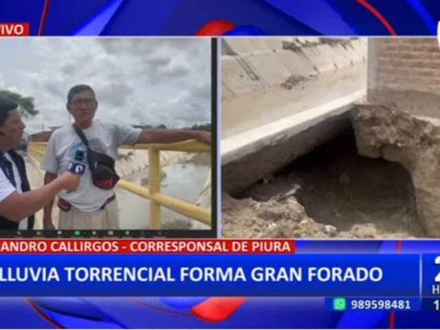 La crisis climática continúa ocasionando estragos en la región de Piura, donde se ha registrado un enorme forado cerca a un puente peatonal en la localidad de Coscomba, provocada por una intensa lluvia torrencial.