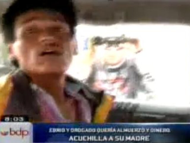 Drogado y en completo estado de ebriedad, José Luis Huachas Huanta acuchilló por la espalda a su madre, Dominga Huanta, dejándola en cuidados intensivos, luego de que ella no quisiera darle dinero ni comida.24 Horas. Edición Mediodía.