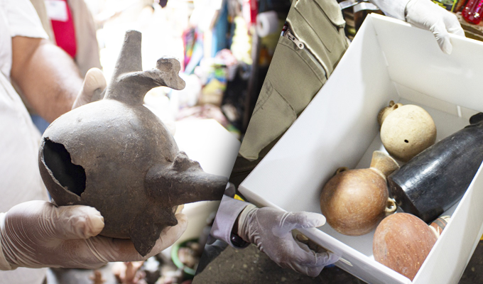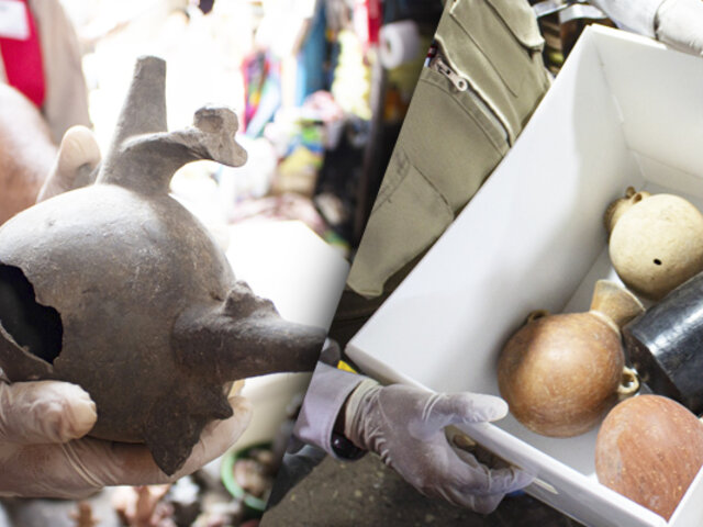 Entre los objetos incautados figuran seis cántaros y dos botellas de cerámica, que, según los especialistas, serían piezas pertenecientes a las antiguas culturas Lambayeque, Chimú y Chancay.