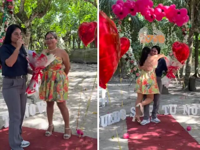 El hecho ocurrió en un campo abierto de la selva, donde Tania Pinedo preparó una escena cuidadosamente planificada: un arreglo floral en forma de corazón, globos, alfombra roja y letras gigantes con la frase “¿Aceptas ser mi novia?”. Lis Padilla llegó al lugar con los ojos vendados, sin sospechar lo que estaba a punto de vivir, acompañada de sus hijos, quienes fueron testigos del especial momento.