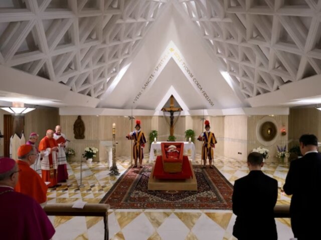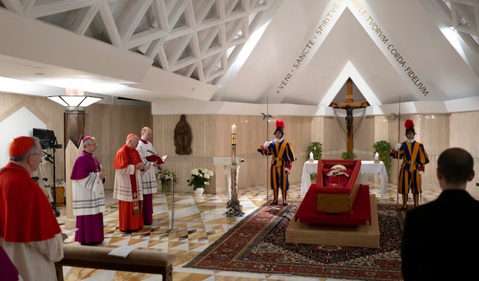 Asimismo, se observa también el féretro de madera, forrado en terciopelo rojo, el cual fue ubicado en la capilla privada de Santa Marta, rodeado de colaboradores cercanos y cardenales presentes en Roma.