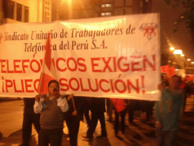 Empleados de Telefónica del Perú se movilizaron desde su local sindical hasta la sede de la empresa ubicada en la avenida Arequipa. Los manifestantes exigen que se atienda su pliego de reclamos.