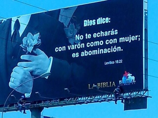 El cartel se hizo conocido en medio del debate por el proyecto de ley de la Unión Civil para personas del mismo sexo, y ubicado en la cuadra 18 de la Av. Universitaria, frente a la PUCP, citaba a la Biblia: "No te echarás con varón como con mujer; es abominación".
