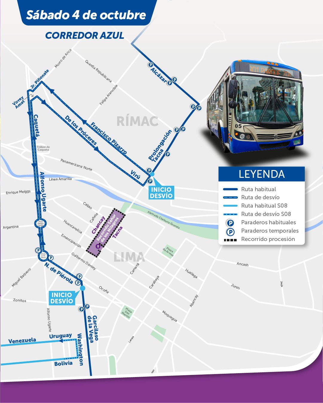 En cuanto a los corredores complementarios, el Corredor Azul pasará por las avenidas Prolongación Tacna, Francisco Pizarro, Caquetá, Alfonso Ugarte y Nicolás de Piérola, retomando luego su ruta por Garcilaso de la Vega hacia Barranco y Miraflores. En sentido contrario, hacia el Rímac, circulará por Nicolás de Piérola, Alfonso Ugarte y Caquetá, habilitándose paraderos temporales en Nicolás de Piérola y la plaza Dos de Mayo (ver mapa).
