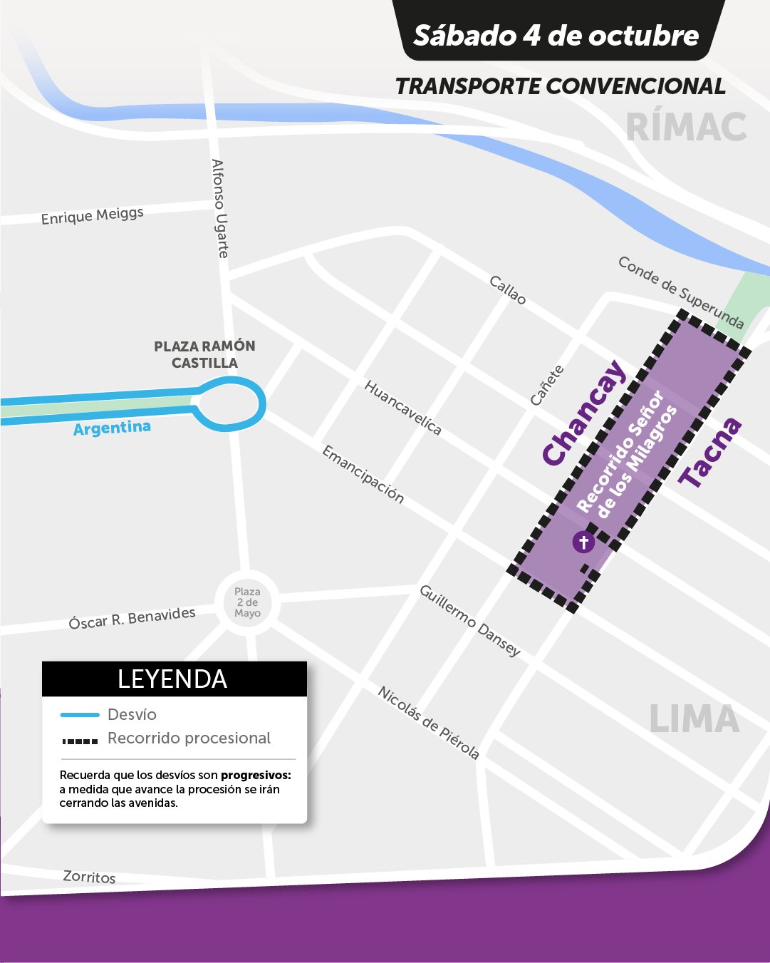 La Autoridad de Transporte Urbano para Lima y Callao (ATU) anunció que este sábado 4 de octubre se aplicarán desvíos en los servicios del Metropolitano, corredores complementarios y transporte convencional debido al primer recorrido del Señor de los Milagros, que iniciará al mediodía desde el Santuario de Las Nazarenas, en la avenida Tacna. El personal de la entidad ya viene orientando a los usuarios y vecinos sobre las rutas alternas.