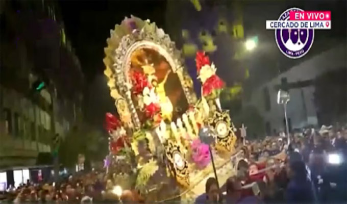 Como es tradicional, miles de fieles acompañaron la procesión del Señor de los Milagros que ayer, al mediodía, salió de la iglesia Las Nazarenas, en su primer recorrido del año las andas fueron llevadas solo por calles cercanas al templo.
