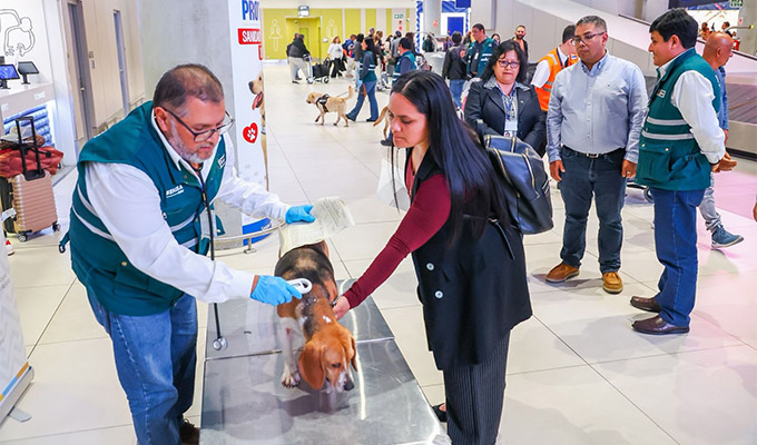 Asimismo, presenció el proceso de inspección de equipajes en llegadas internacionales y la revisión sanitaria de mascotas, principalmente perros y gatos, que ingresan al territorio nacional a fin de emitir el con eso evitamos de que alguna enfermedad que viene de otro país llegue y se impregne acá en Perú y pueda malograr nuestras agroexportaciones.