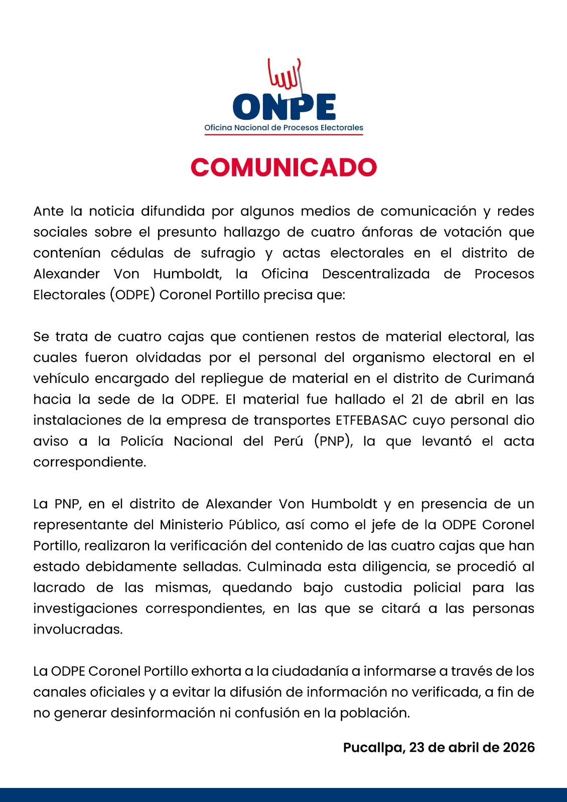 Ante esta situación, la Oficina de Procesos Electorales (ONPE) difundió un comunicado donde compartió detalles del hallazgo del material, el cual olvidado por personal de la entidad. Además, mencionaron que pudieron recoger las actas, las que actualmente se encuentran en manos de la PNP.