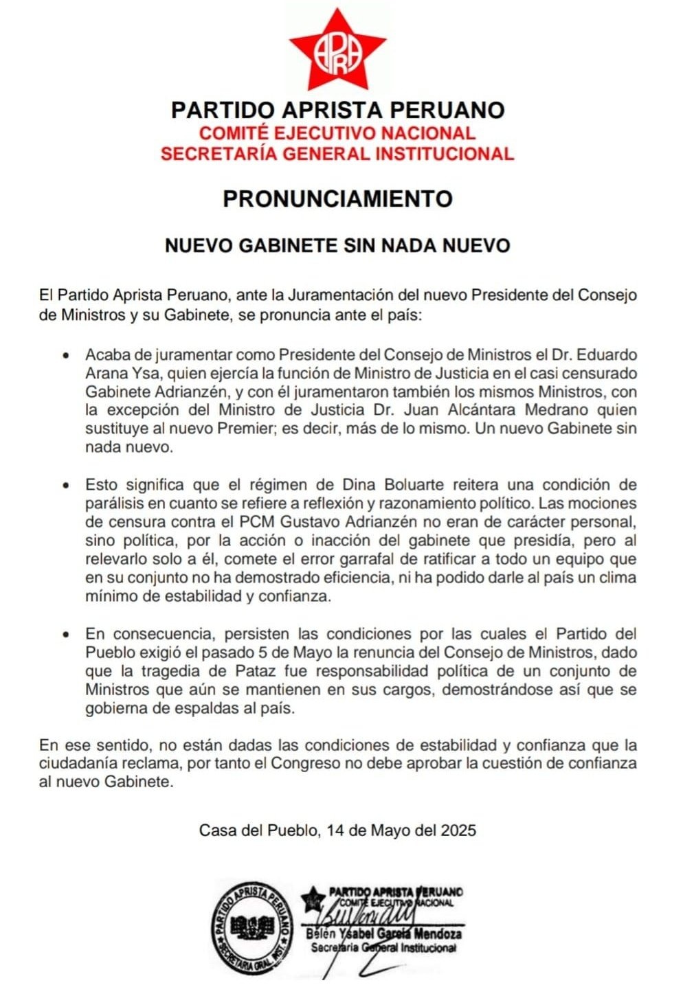 En ese sentido, el Partido Aprista exhortó al Congreso de la República a negarle el voto de confianza al Gabinete de Arana Ysa, alegando que "no están dadas las condiciones de estabilidad y confianza que la ciudadanía reclama".