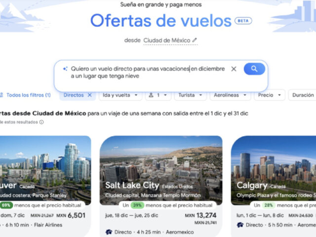 Los viajeros pueden ingresar solicitudes como "Quiero una semana de vacaciones en febrero desde Ciudad de México, busco un buen precio en un vuelo sin escalas a una ciudad con buen clima y buena comida". La IA interpreta estos matices y, utilizando datos en tiempo real de Google Vuelos, presenta opciones relevantes de cientos de aerolíneas y sitios de reserva.